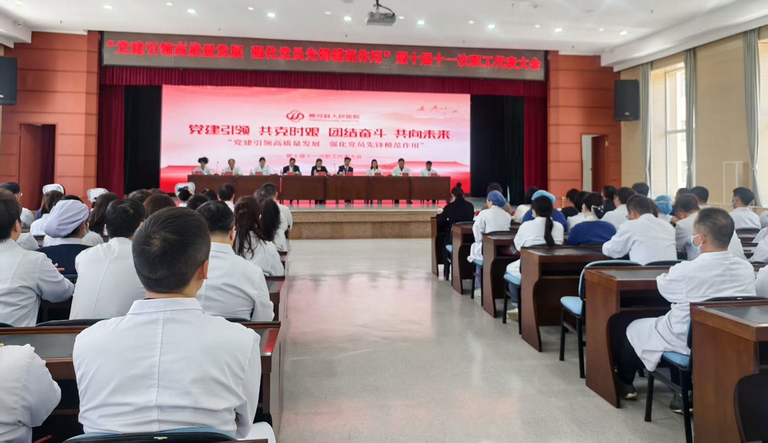 2月25日下午,柳河县人民医院组织全体党员、职工在多功能厅召开了“党建引领高质量发展 强化党员先锋模范作用”暨十届十一次职工代表大会。会议特邀请曹丹副县长、县委组织部副部长罗娜、县纪检委派驻卫健局纪检组长赵海燕、县总工会副主席王亚彬、县委社会工作部副部长刘倡、县卫健局局长周鑫出席,医院院务会及职工200余人参加会议。会议共五项议程。