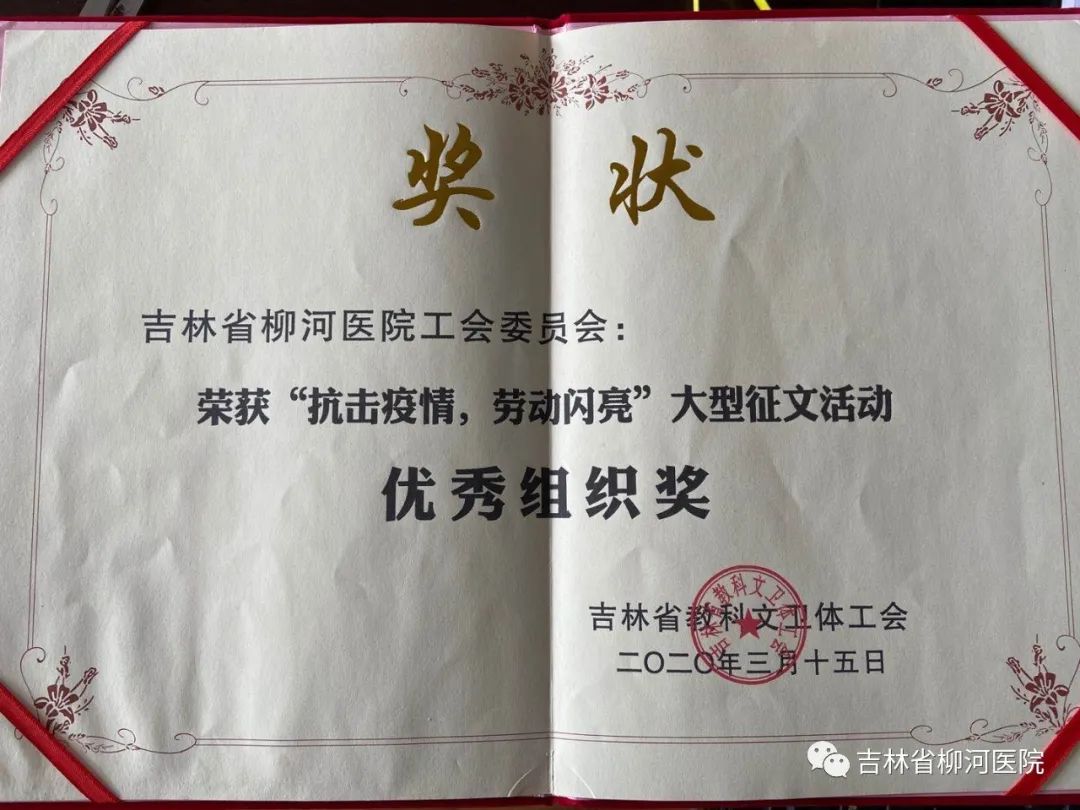 近日,柳河县人民医院工会在吉林省总工会联合《中国工人》杂志社、全国工会电子职工书屋共同推出“抗击疫情,劳动闪亮”大型征文活动中荣获优秀组织奖。